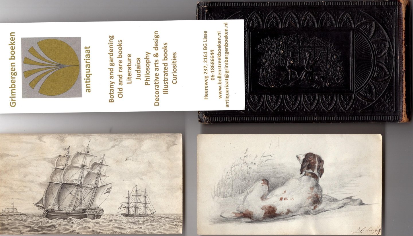 l Contributors: C. C. [Constantia Cornelia] de Hen; J. P. Zuurdeeg, with a fine pencil drawing of two sailing ships on sea, dated Leyden, 1855 (Jacobus Paulus Zuurdeeg, born Leiden 1822, captain on a merchant ship); artist Johan Coenraad Leich (1823-1890) with a wonderful coloured drawing of a lying dog; J. M. Creighton, embroderie, dated Den Helder 1850 (Jacoba Maria Creyghton (1836-1915); a pencil drawings of a castle by Beijs?, dated 1852, another castle with the initial V. N.