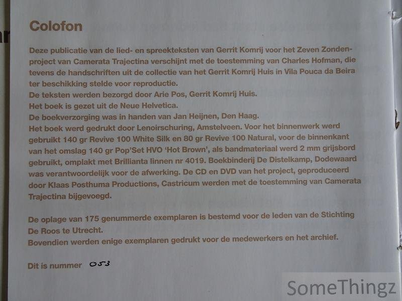 Oplage beperkt tot 175 genummerde exemplaren. Dit is nummer 053. Deze publicatie bevat: 1) een boekje met liedteksten, ingeleid door Arie Pos, 2) een boekje met spreekteksten, 3) een boekje met de facsimile's van Komrij's handschrift, 4) een dvd (opname van de oorspronkelijke uitvoering door Camerata Trajectina) en 5) een cd (spreek- en liedteksten).