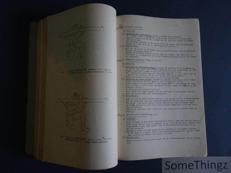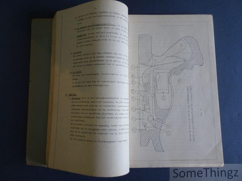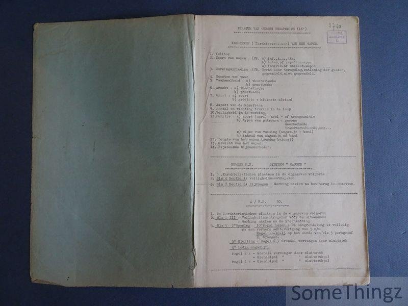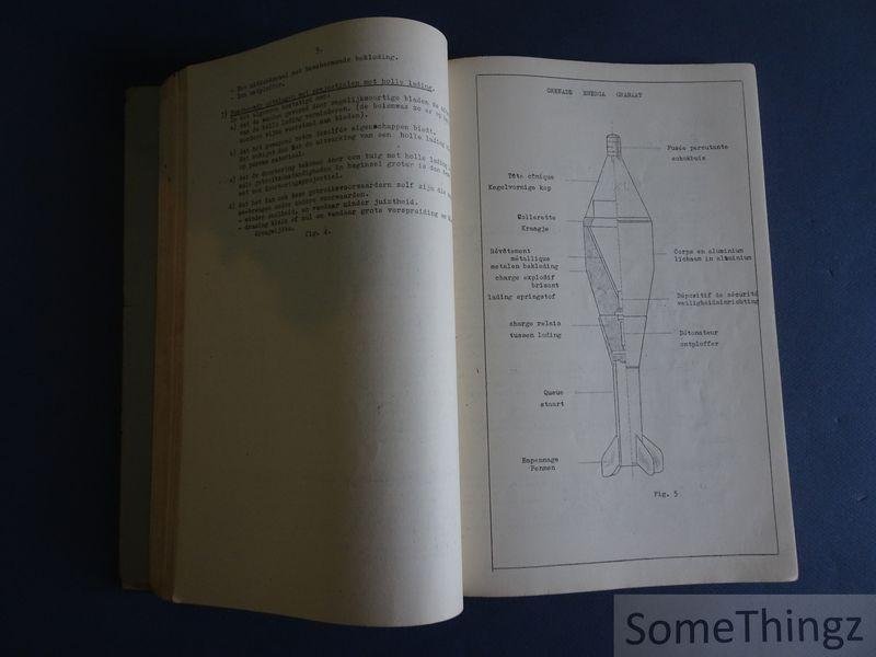 Schaarse cursus voor Belgische soldaten betreffende het gebruik van vuurwapens, granaten, en landmijnen. Interessant ook om wille van de vele technische tekeningen van de onderdelen en opbouw van de wapens. Inhoud (onder andere): Mauser, mitraillette Thompson, mitrailleurkarabijn sten, handmitrailleur Vigneron, automatisch pistool, Browning, Energa granaat, raketwerper blindicide, zware mitrailleuze browning kaliber .50, handgranaat n° 36 (mills), landmijnen.