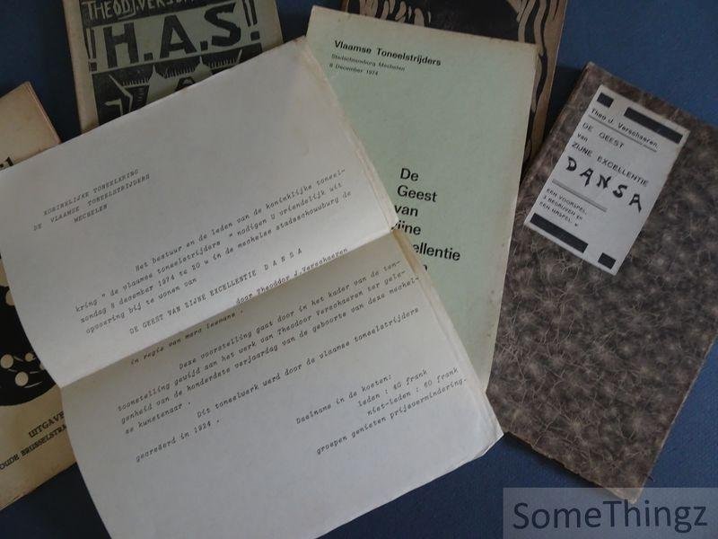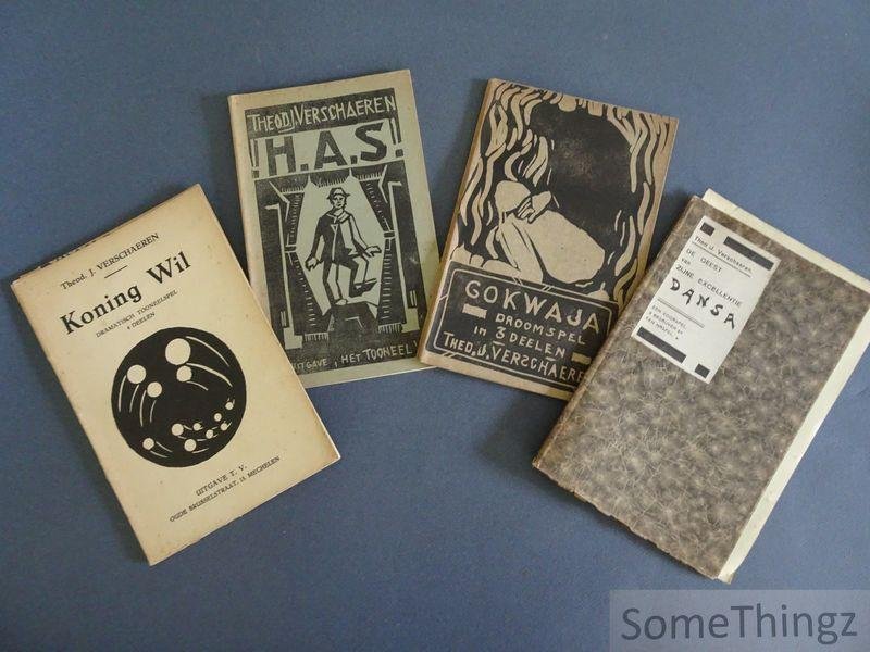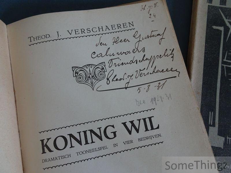 | Meer info: | Schaarse collectie van 4 publicaties, elk met een mooie grafische frontcover, van de gekende Mechelse kunstenaar, graficus en dramaturg Theodoor Verschaeren. Met mooie handgeschreven opdracht op de titelpagina van 'Koning Wil'. |