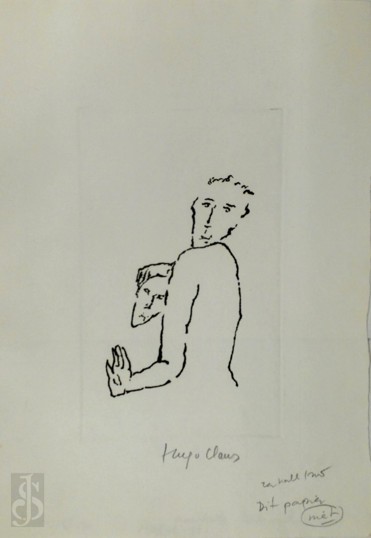 Originele ets, gesigneerd in potlood ‘Hugo Claus’.[1991]. \nMet annotatie van de uitgever 'Zerkall. Dit papier niet'.\n* Proefdruk op afwijkend papier. Ets als frontispice voor ‘Hugo Claus – Ontmoeting met Hans Andreus’, Amstelveen, Amo, 1991. Uitgevoerd in vernis-mou en op de plaat geëtst door Joost Veerkamp.\n9,8 x 16 cm.