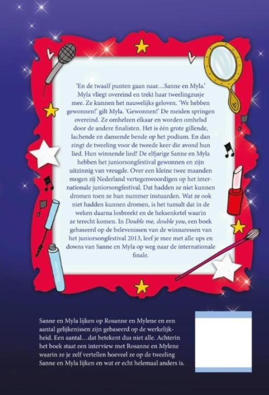 'En de twaalf punten gaan naar...Sanne en Myla.'Myla vliegt overeind en trekt haar tweelingzusje mee. Ze kunnen het nauwelijks geloven. 'We hebben gewonnen!' gilt Myla. 'Gewonnen!'De meiden springen overeind. Ze omhelzen elkaar en worden omhelsd door de andere finalisten. Het is één grote gillende, lachende en dansende bende op het podium. En dan zingt de tweeling voor de tweede keer die avond hun lied. Hun winnende lied!De elfjarige Sanne en Myla hebben het juniorsongfestival gewonnen en zijn uitzinnig van vreugde. Over een kleine twee maanden mogen zij Nederland vertegenwoordigen op het internationale juniorsongfestival. Dat hadden ze niet kunnen dromen toen ze hun nummer instuurden.Wat ze ook niet hadden kunnen dromen, is het tumult dat in de weken daarna losbreekt en de heksenketel waarin ze terecht komen. In "Double me, double you", een boek gebaseerd op de belevenissen van de winnaressen van het juniorsongfestival 2013, leef je mee met alle ups en downs van Sanne en Myla op weg naar de internationale finale.