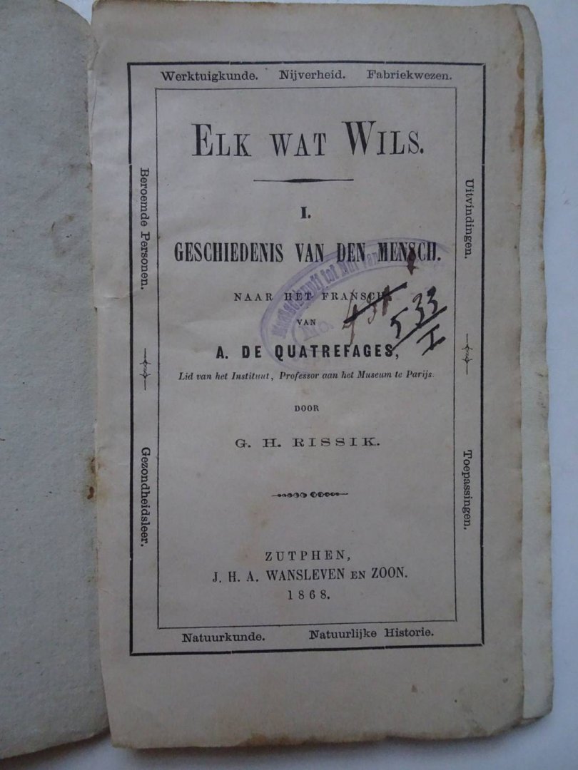 | Bijzonderheden: | 1868; J.H.A. Wansleven & Zoon; zachte kaft, blanco bandje; 9,5x15,5 cm.; naar het Frans van A. de Quatrefaces; 63 p. |