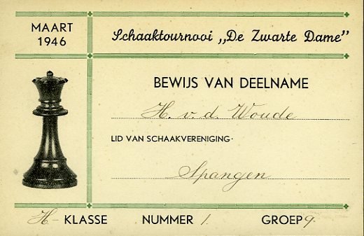 | Titel: | Bewijs van deelname den heer H. v.d. Woude (lid van schaakvereniging Spangen) - Bevrijdingstoernooi van den Rotterdamschen Schaakbond + Schaaktournooi ,,De Zwarte Dame" |