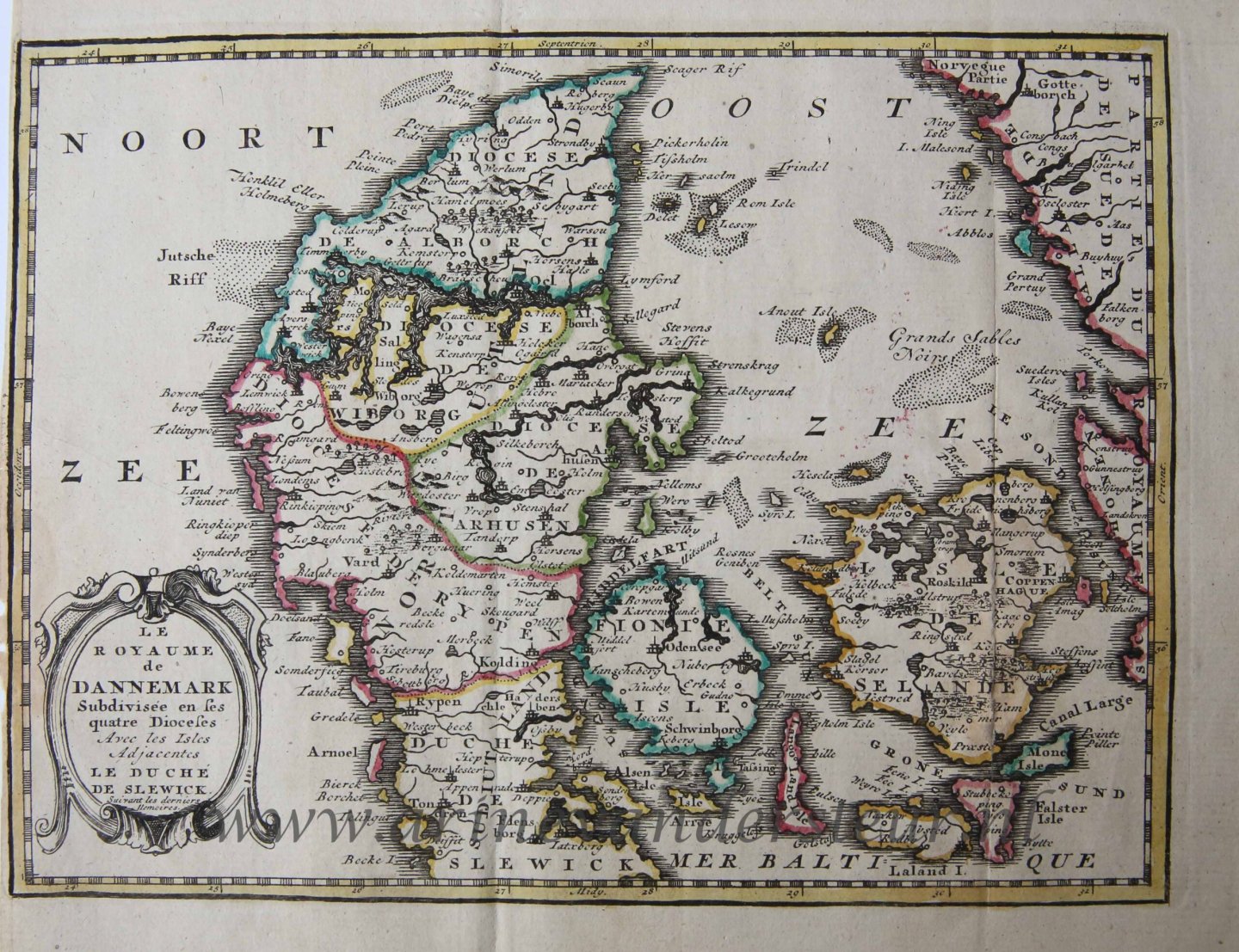 | Bijzonderheden: | Map of the Reign of Denmark. Titled on the bottom left: 'LE ROYAUME de DANNEMARK Subdivisée en ses quatre Dioceses Avec les Isles Adiacentes LE DUCHE DE SLEWICK Suivant les derniers ...'Hand colored map, published in Amsterdam in 1749 by Hendrik ... |