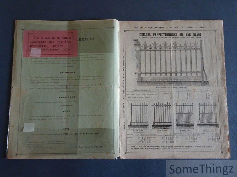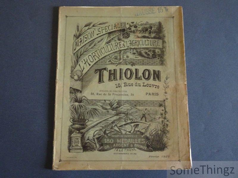 ![N/A. - Thiolon. - Thiolon 16, Rue du Louvre Paris. Maison spéciale pour l'horticulture & l'agriculture. Spécialité de clotures por Parcs, Chasses et Jardins. Grilles - Portes - Marquises. [Catalogue des produits, février 1923.] N/A. - Thiolon. - Thiolon 16, Rue du Louvre Paris. Maison spéciale pour l'horticulture & l'agriculture. Spécialité de clotures por Parcs, Chasses et Jardins. Grilles - Portes - Marquises. [Catalogue des produits, février 1923.]](https://images.boekwinkeltjes.nl/medium/ybWqq0M2r4tKZasiSYVJ.jpg)