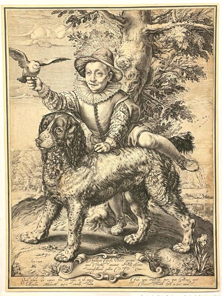 | Bijzonderheden: | Portrait of Frederik de Vries as young boy playing with Goltzius' dog. He was the son of the painter Dirck de Vries, a pupil of Goltzius. The boy is trying to get on the back of the dog while holding a bird in his hand.On the cartouche below some ... |