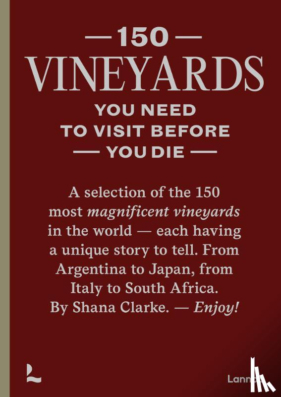 Flaptekst After 150 Bars, Restaurants, Hotels, Houses, Gardens and Golf Courses, there is now also 150 Vineyards you need to visit before you die. For lovers of wine, both professional and hobbyists, and of nature, vineyards are real must-see places. These vineyards can often be found in the most scenic regions in the world where you can wander for hours, or unexpectedly, right in the middle of the city. A selection of the most unique and worth visiting vineyards in the world, from Japan to Argentina and from South Africa to France. Discover in this guide how to visit the vineyards, the many exceptional stories and - of course - where to taste wine. Cheers! |