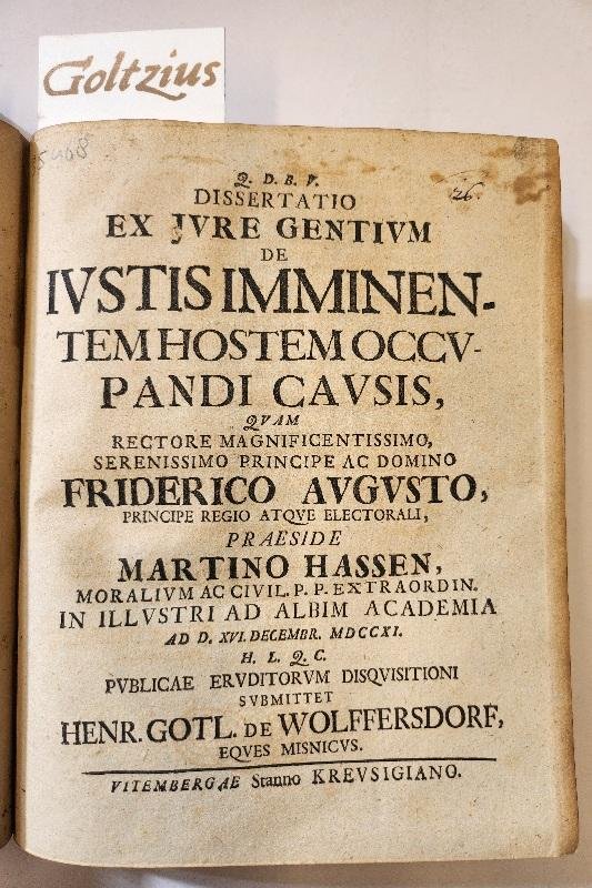 Dissertatio ex jure gentium de iustis imminentem hostem occupandi causis, quam rectore magnificentissimo serenissimo principe ac domino Friderico Augusto, principe regio atquw electorali, preaside Martino Hassen, moralium ac civil. p.p. extraordin. in illustri ad albim academia ad d. XVI. Decembt. MDCCXI. H.L.Q.C. publicae eurditorum disquisitioni submittet Henr. Gotl. de Wolffersdorf, eques misnicus Wittenberg, Stanno Krevsigiano, 1711, 4to.. unbound, 24 pp., in good condition with only some minor stains, with al lovely woodcut headpiece and initial. Dissertation in the field of law.