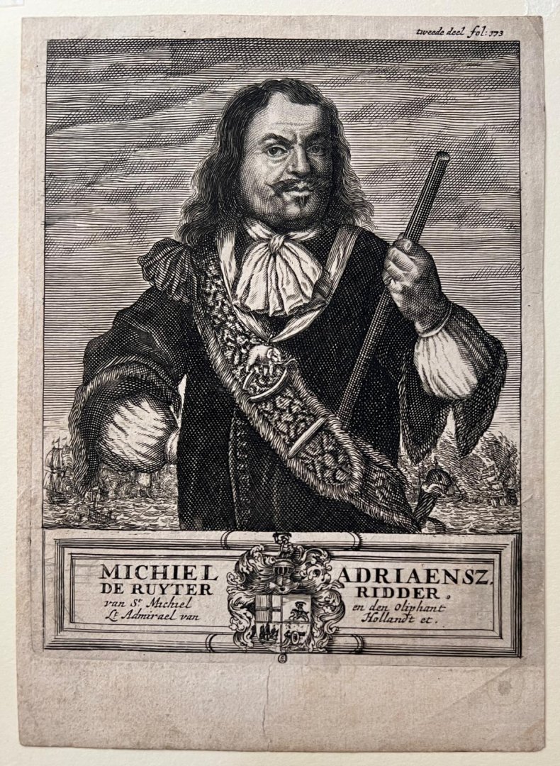 | Titel: | Antique print, etching | Portrait of Michiel de Ruyter (1607-1676) - After A. Bloteling, published 1676, 1 p. |