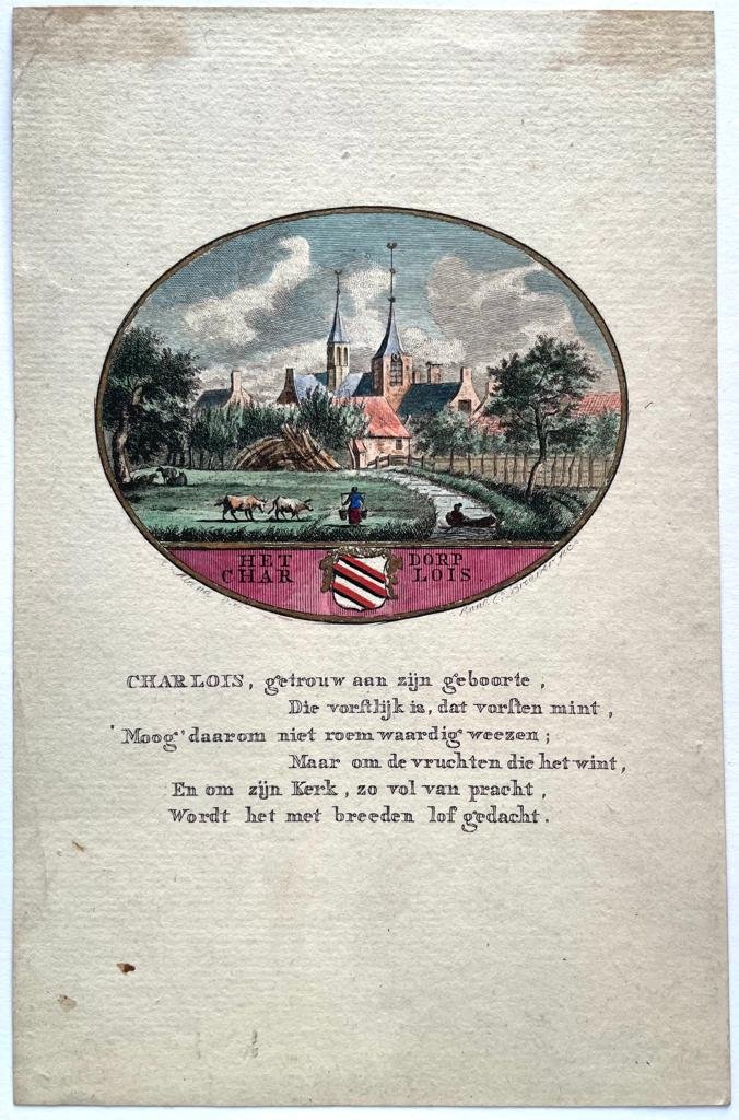 | Bijzonderheden: | Copperplate etching/engraving of the village of Het dorp Charlois, in the Dutch province of Zuid-Holland. City view / Village view in an oval cartouche, accompanied by the city crest and title. Underneath the cartouche, a text is printed, praising... |