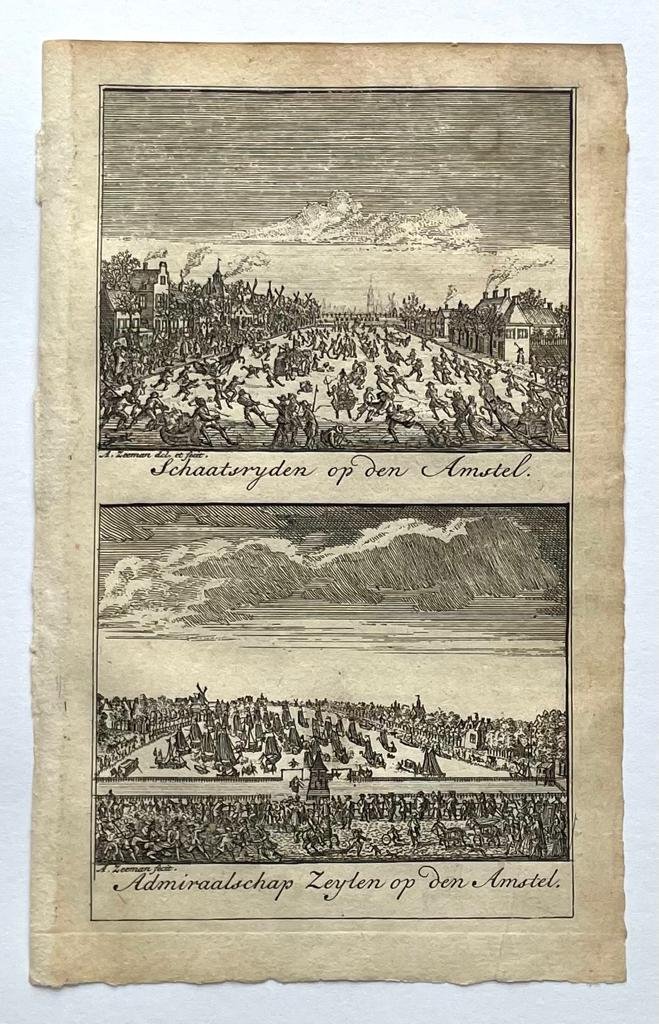 | Titel: | Antique print, etching, 1730 | Schaatsryden (schaatsen, ice skating) op den Amstel. / Admiraalschap Zeylen op den Amstel, 1 p. |