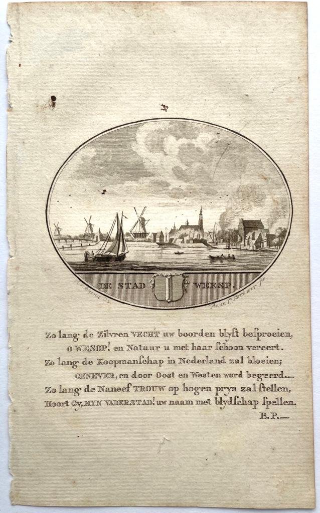 | Bijzonderheden: | Copperplate etching/engraving of the city of Weesp, in the Dutch province of Noord-Holland. City view / Village view in an oval cartouche, accompanied by the city crest and title. Underneath the cartouche, a text is printed, praising the depicted ... |