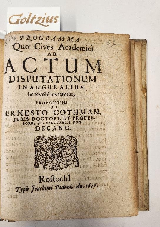 Programma Quo Cives Academici ad actum disputationum in auguralium benevolè invitantur, propositum ab Ernesto Cothman, juris doctore et professore, p.t. spectabili dno decano. Rostock, Typis Joachimi Pedani, 1617, 4to., without binding, [8] pp., with a woodcut vignet on the titlepage and a decorative initial and endpiece.