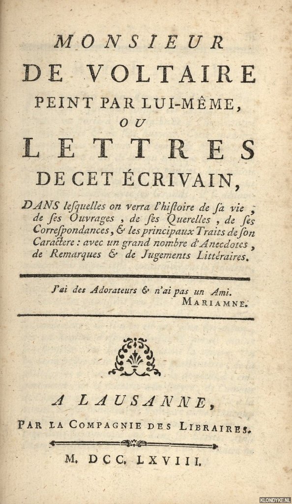 | Titel: | Monsieur de Voltaire, peint par lui-même, ou lettres de cet écrivain (...) |