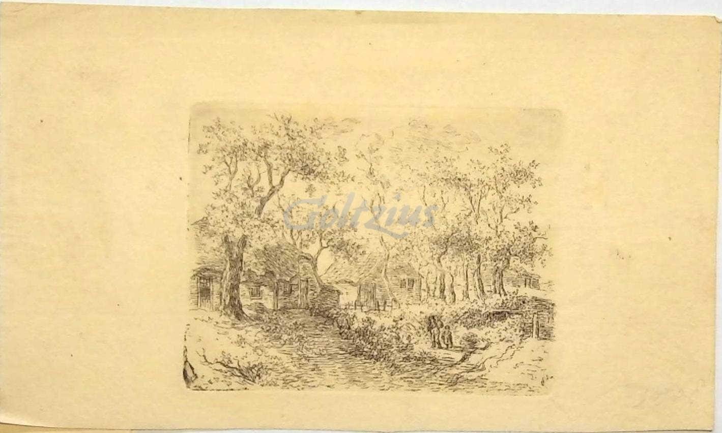 Father and child walking along a tree-lined path Etching on laid paper, by an anonymous artist, late 18th century, platemark 60 x 77 mm., sheet size 88 x 150 mm., some faint soiling in the (ample) margins, otherwise excellent. Charming little scene in the style of Hermanus Fock, with three buildings in the background, with a shaded path in the foreground. The father carries a knapsack with the child walking beside him.