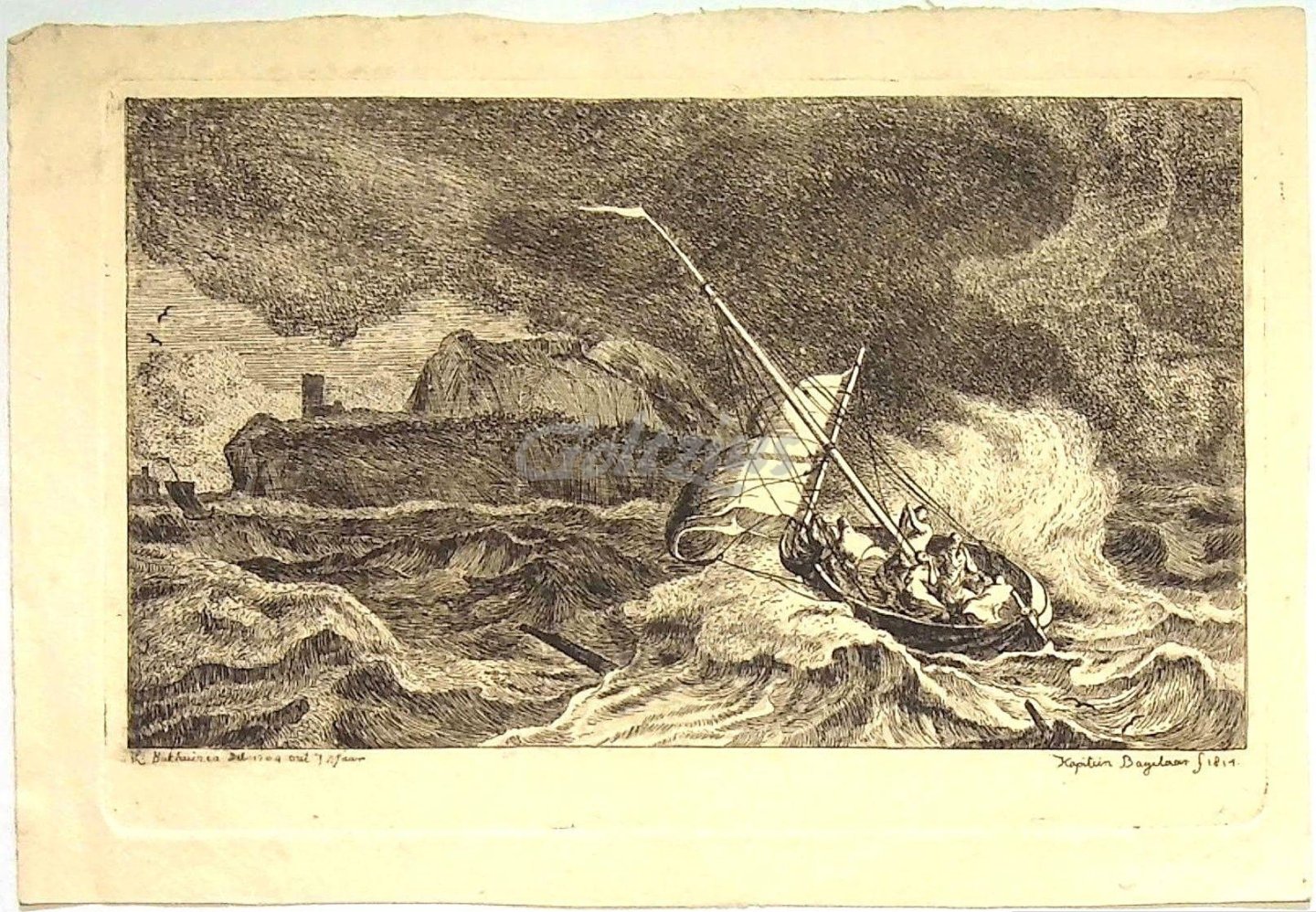 Christ and the apostles in a storm on the Sea of Galilee Etching on wove paper, by Ernst Willem Jan Bagelaar, after the painting Ludolf Backhuysen from 1704, executed in 1814, signed and dated below the image, platemark 99 x 152 mm., sheet size 118 x 170 mm. A threatening scene with dark tones and high waves. Although Bagelaar (1775-1837) was originally an army man, he soon turned to a life of art after instructing himself in etching, basing many of the etchings on his own designs. Literature: E123.