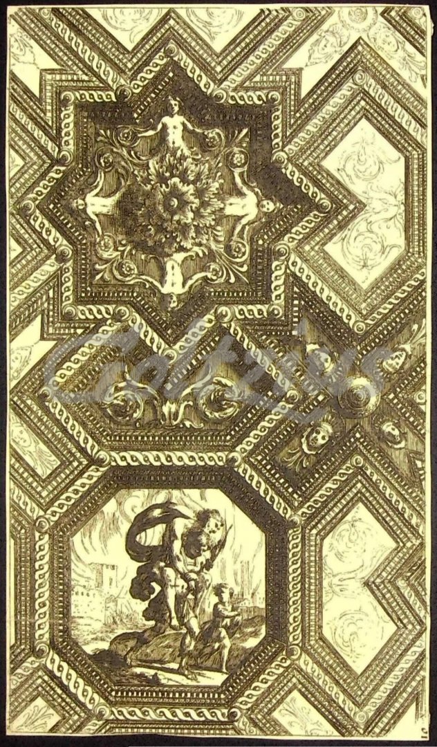 Ceiling design with Aeneas carrying his father Etching on laid paper, by Jacques Lepautre after the designs of Adam Philippon from the book "Curieuses recherches de plusieurs beaus morceaus d'ornemens antiques et modernes, tant dans la ville de Rome ques autres villes et lieux d'Italie" published in 1645, sheet size 231 x 135 mm., cropped within platemark, otherwise excellent. An ornamented ceiling with an octagonal coffer that contains an image of Aeneas fleeing Troy with Anchises and Ascanius. Above that a rosette surrounded by four figures and acanthus scrolls in a star-shaped panel.