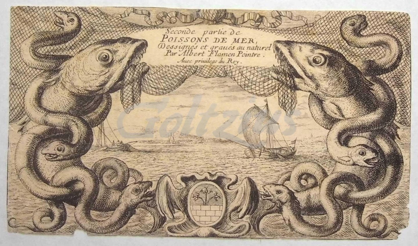 Title vignette for 'Seconde partie de Poissons de Mer' The title vignette for the second part of 'Diuerses especes de poissons de mer' (Paris, Jacques van Merle, ca. 1650). Etching on laid paper, made by Albert Flamen after his own design, image 96 x 169 mm., cropped within platemark, small damage lower right corner and lower edge, on the rear two stamps from Rijksprentenkabinet Leiden (Lugt 1665 and 700b). Literature: Bartsch 13, Robert-Dumesnil 427. Albert Flamen (ca. 1620 - after 1669) was a Flemish engraver, active in Paris where he worked mainly as illustrator on numerous publications. l Naval scene with sailboats within a decorative border of eels and fishing nets; the coat of arms of Monsieur Tronson lower middle.