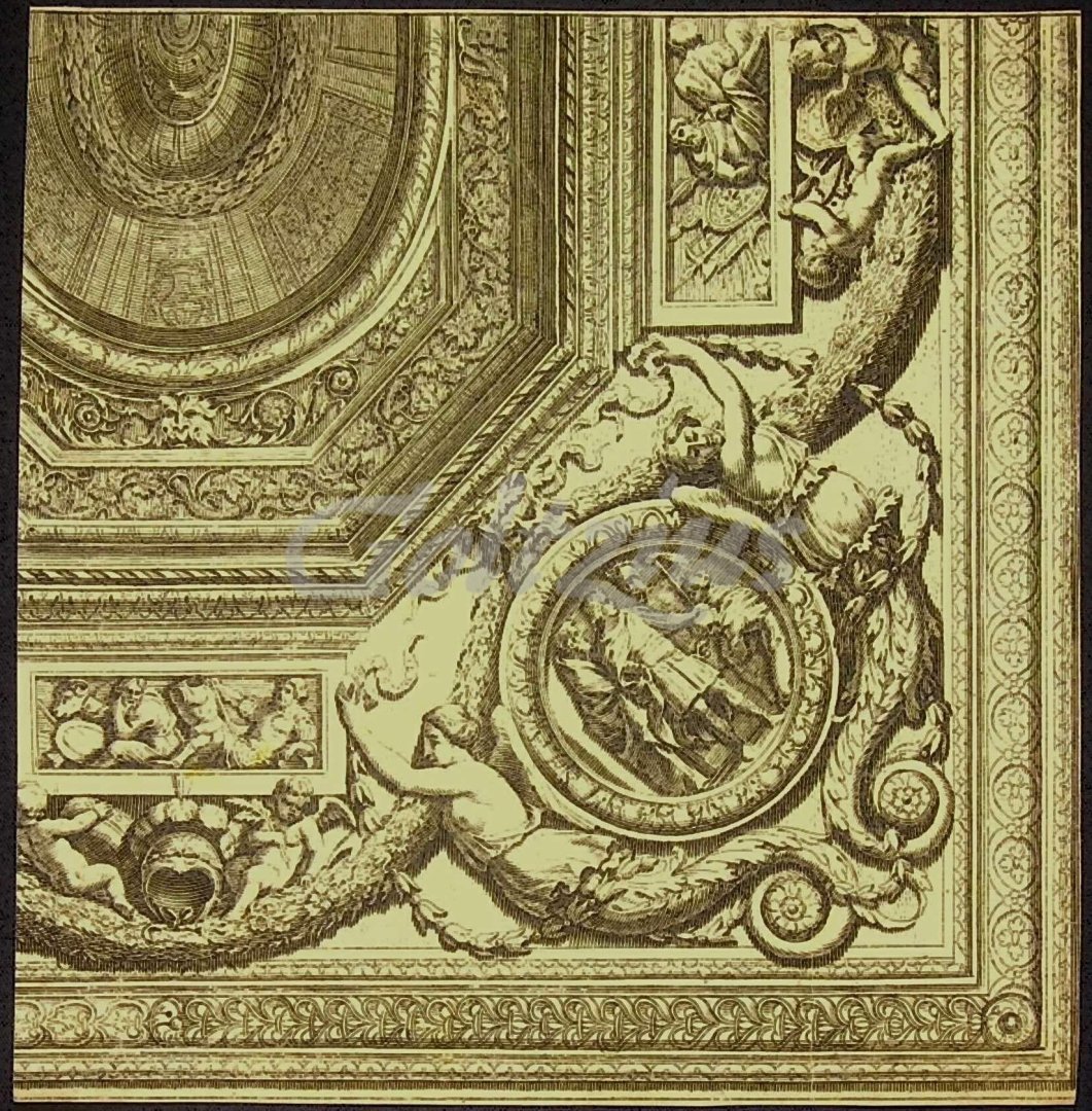 Corner of a ceiling ornament Etching/engraving on laid paper, by an anonymous artist (in the style of Jacques Lepautre), sheet size 177 x 171 mm., cropped within platemark (possibly with loss of image on the left). A curious print, probably a book illustration (given the presence of a fold in the left edge of the sheet) from around 1650.