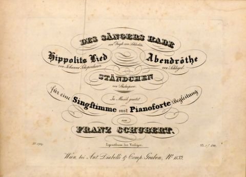 | Titel: | Des Sängers Habe von Freyh von Schlechta. Hippolits Lied von Johanna Schopenhauer. Abendröthe von Schlegel. Ständchen von Shakespeare. In Musik, gesetzt für eine Singstimme mit Pianoforte Begleitung von Franz Schubert [(Franz Schubert`s Nachge... |