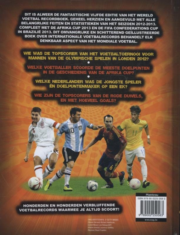 Dit is alweer de fantastische vijfde editie van het Wereldvoetbal recordboek. Geheel herzien en aangevuld met allebelangrijke feiten en statistieken van het seizoen 2012-2013.Compleet met de Afrika Cup 2013 en de FIFA Confederations Cupin Brazilië 2013. Dit omvangrijke en schitterend geïllustreerdeboek over internationale voetbalrecords behandelt elkdenkbaar aspect van het mondiale voetbal.Wie was de topscorer van het voetbaltoernooi voormannen van de Olympische Spelen in Londen 2012? -Welke voetballer scoorde de meeste doelpuntenin de geschiedenis van de Afrika Cup? -Welke Nederlander was de jongste speleren doelpuntenmaker op een EK? -Wie zijn de topscorers van de Rode Duivels,en met hoeveel goals?
