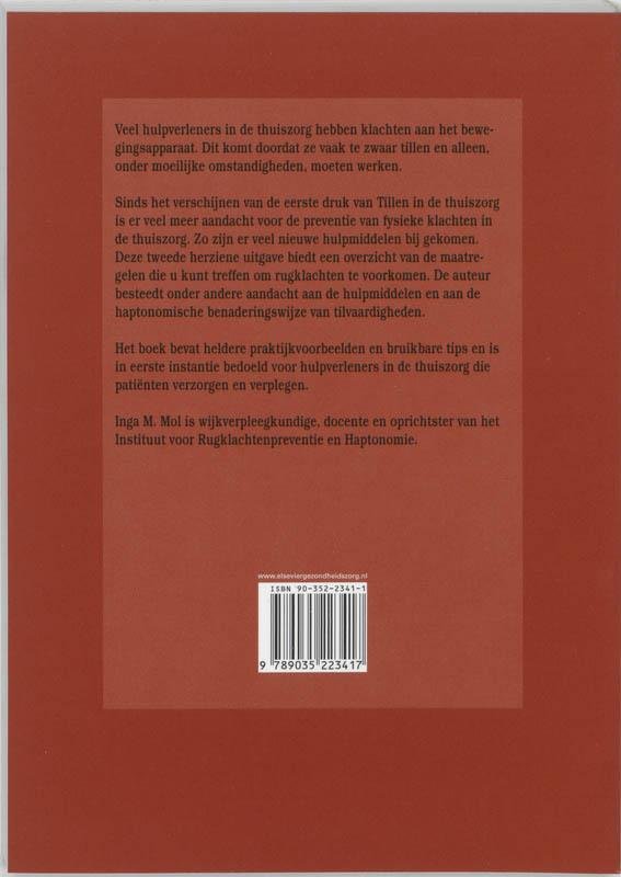 Sinds het verschijnen van de eerste druk van Tillen in de thuiszorg is er veel meer aandacht voor de preventie van fysieke klachten in de thuiszorg. Zo zijn er veel nieuwe hulpmiddelen bij gekomen. Deze tweede herziene uitgave biedt een overzicht van de maatregelen die u kunt treffen om rugklachten te voorkomen. De auteur besteedt onder andere aandacht aan de hulpmiddelen en aan de haptonomische benaderingswijze van tilvaardigheden. Het boek bevat heldere praktijkvoorbeelden en bruikbare tips en is in eerste instantie bedoeld voor hulpverleners in de thuiszorg die patiënten verzorgen en verplegen. Inga M. Mol is wijkverpleegkundige, docente en oprichtster van het Instituut voor Rugklachtenpreventie en Haptonomie. |