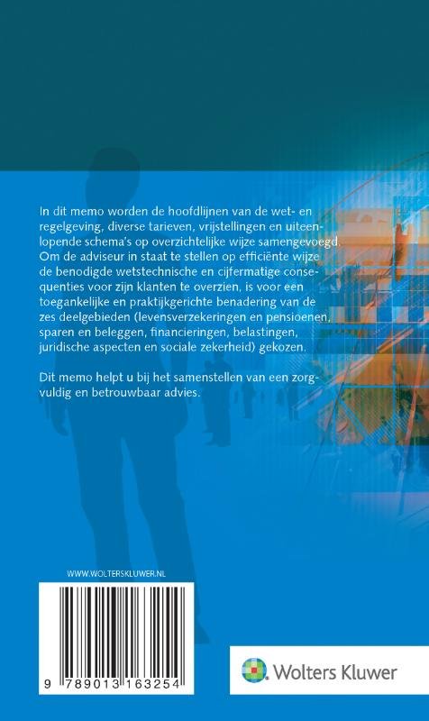 Schrijft u regelmatig financiële (deel)plannen, of brengt u hierover advies uit? Op die momenten komt dit memo goed van pas, dankzij een overzicht op hoofdlijnen van de relevante wet- en regelgeving, tarieven, vrijstellingen en uiteenlopende schema#s. U vindt hierin alle deelgebieden van financiële planning op overzichtelijke wijze samengebracht. Het memo is heel geschikt als voorbereiding op examens binnen de financiële dienstverlening. Schrijft u regelmatig financiële (deel)plannen, of brengt u hierover advies uit? Op die momenten komt dit memo goed van pas, dankzij een overzicht op hoofdlijnen van de relevante wet- en regelgeving, tarieven, vrijstellingen en uiteenlopende schema#s. U vindt hierin alle deelgebieden van financiële planning op overzichtelijke wijze samengebracht. Het memo is heel geschikt als voorbereiding op examens binnen de financiële dienstverlening. Wanneer u zich beroepsmatig regelmatig buigt over financiële plannen, dan kunt u niet zonder naslagwerk van alle actuele wetgeving en getallen. Memo Financiële planning 2021 staat sinds jaar en dag bekend als een handzaam en tegelijkertijd compleet overzicht op dit vlak. U vindt hierin de belangrijkste wet- en regelgeving, diverse tarieven, vrijstellingen en uiteenlopende schema#s opgenomen omtrent de financiële planning. Het Memo is heel handig ter voorbereiding van tentamens en examens voor bijvoorbeeld hogescholen, Wft, EFA en FFP. Overzicht financiële planning Met zijn overzichtelijke en beknopte insteek, stelt de bundel u in staat gemakkelijk en snel de benodigde wetstechnische en cijfermatige consequenties voor de financiële planning van uw clientèle te overzien. De sterk praktijkgerichte benadering verschaft u een helder en geïntegreerd beeld van deze zes deelgebieden: levensverzekeringen en pensioen sparen en beleggen financieringen belastingen juridische aspecten sociale zekerheid Kortom: met dit memo heeft u alles bij de hand om zorgvuldig en betrouwbaar advies op te stellen, zonder u te verliezen in het speurwerk naar de laatste informatie. Daarnaast is de titel toegestaan bij het doen van verschillende examens.