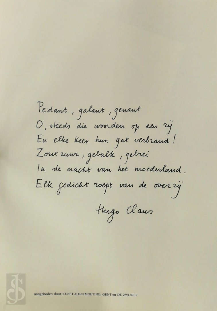| Meer info: | Rijmprent met gedicht van Hugo Claus\n'Aangeboden door Kunst & Ontmoeting, Gent en De Zwijger'\nLichtjes gekreukt ex. |