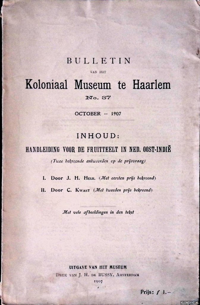 | Bijzonderheden: | Paperback; 1907; 209pp.; Omslag vlekkig; slijtage randen en hoeken. -- Conditie: Redelijk; Oorspronkelijk omslag, hier en daar kleine z/w afbeeldingen, 8vo; Bulletin van het Koloniaal Museum te Haarlem No. 37. October 1907. |