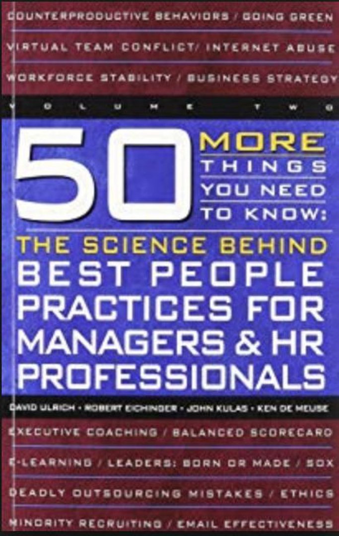 These books, 100 Things Your Need to Know: Best People Practices for Managers & HR and 50 More Things You Need to Know: The Science Behind Best People Practices for Manager & HR Professionals (whew!), are curious and different from most books that I've seen on similar topics. As you might guess from the titles, they contain 150 chapters between them, covering sup-toics like selection, Human Resources law, leadership, HR metrics, corporate culture, training, recruiting, HR technology systems, compensation, benefits, motivation, organizational development, job design, teams, performance management, surveys, and more.