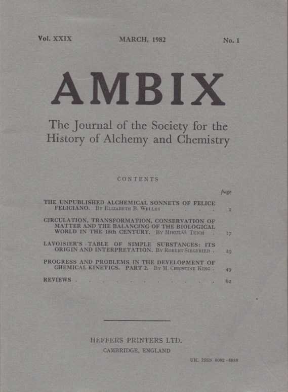 | Titel: | Ambix. The Journal of the Society for the History of Alchemy and Early Chemistry Vol. XXIX, No. 1. March, 1982 |