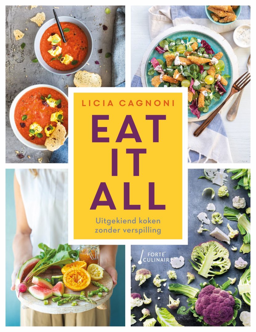 Zero-waste koken: 90 overheerlijke recepten om verspilling tegen te gaan\nIn Eat it all laat Licia Cagnoni zien dat het mogelijk is heerlijk te koken terwijl je verspilling tegengaat en afval binnen de perken houdt. Zie schillen, stronken, loof en korstjes niet langer als ‘waste’, maar leer creatief omgaan met écht alle onderdelen van je ingrediënten. Wat je normaal weggooit, is namelijk meestal gewoon eetbaar en zit ook nog eens vol met voedingsstoffen die goed voor je zijn. \nDe ruim 90 recepten en de tips in dit boek maken duurzaam koken makkelijker en smakelijker dan ooit. Ook leer je hoe je bewuster boodschappen kunt doen en voedsel op de juiste manier kunt bewaren. Je helpt er het milieu, je gezondheid én je portemonnee mee. Ben je er klaar voor?\nLicia Cagnoni is al meer dan 25 jaar chef-kok en heeft veel ervaring in de wereld van de haute-cuisine. Ze werkte mee aan verschillende kookboeken en publicaties. Nu geeft ze, behalve haar activiteiten als food-styliste, kookcursussen en verzorgt ze catering voor evenementen. Met haar creatieve en elegante stijl zorgt ze altijd voor unieke en vernieuwende smaken.