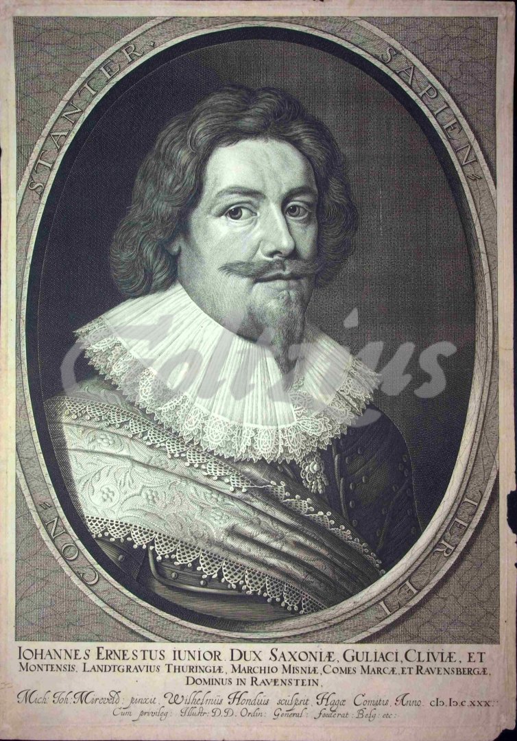 Bust of John Ernest, Duke of Saxony "Iohannes Ernestus Iunior. Dux Saxoniae, Guliaci, Cliviae, et Montensis, Landtgravius Thuringae, Marchio Misniae, Comes Marcae, et Ravensbergae, Diminus in Ravenstein". Engraving on laid paper, by Willem Hondius (ca. 1599 - ca. 1659) after Michiel Jansz. Mierevelt (1567 - 1641), dated 1630. Sheet size: 437 x 309 mm., platemark: 425 x 299 mm. Some paper loss in the right margin, image intact and clean. In good condition. Ref.: Hollstein 42 (2/II).