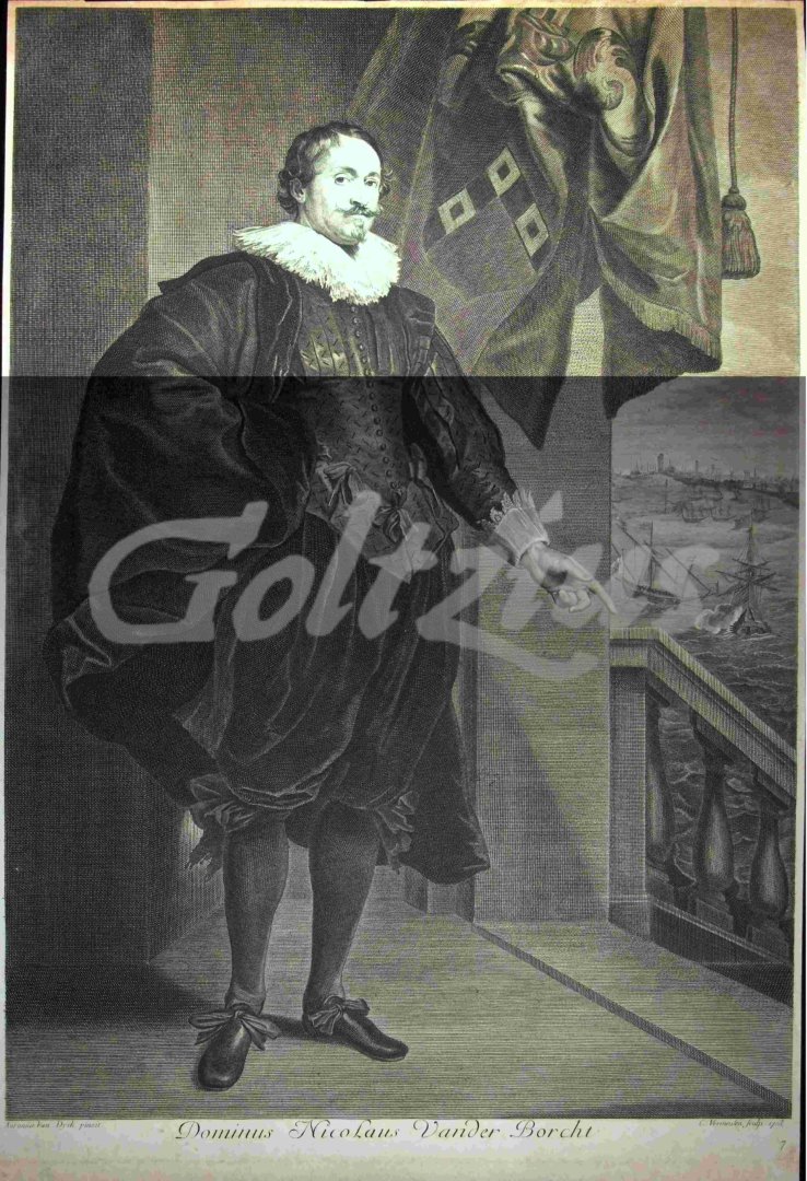 Portrait of Nicolaas van der Borcht Caption: "Dominus Nicolaus Vander Borcht". Engraving on laid paper by Cornelis Vermeulen (ca. 1655 - 1708/09) after Anthony van Dyck (1599 - 1641), dated 1703, sheet size: 532 x 359 mm., cropped within platemark on three sides. Edges and margins a little soiled, otherwise fine. Ref.: Hollstein Vermeulen 89 (3/IV), Le Blanc 12, Muller 557.