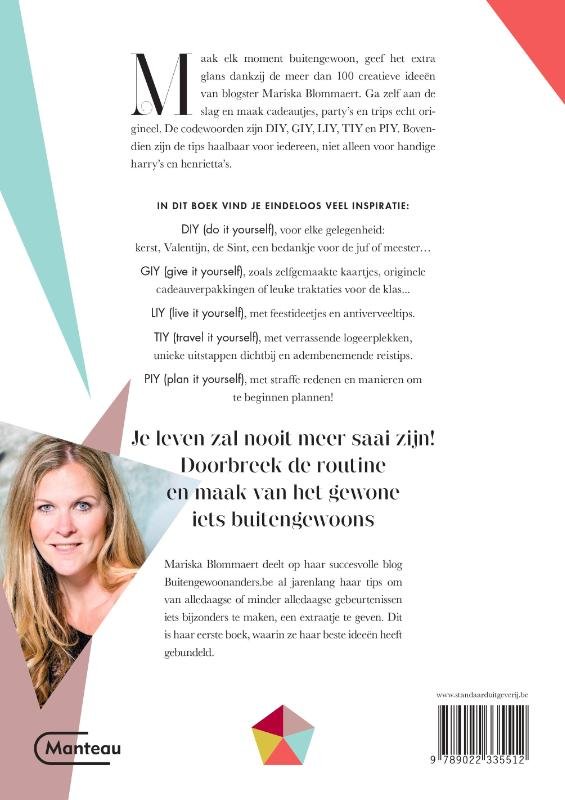Maak elk moment buitengewoon, geef het extra glans dankzij de meer dan 100 creatieve ideeën van blogster Mariska Blommaert. Ga zelf aan de slag en maak cadeautjes, party’s en trips echt origineel. De codewoorden zijn DIY, GIY, LIY, TIY en PIY. Bovendien zijn de tips haalbaar voor iedereen, niet alleen voor handige harry’s en henrietta’s.IN DIT BOEK VIND JE EINDELOOS VEEL INSPIRATIE:DIY (do it yourself), voor elke gelegenheid: kerst, Valentijn, de Sint, een bedankje voor de juf of meester…GIY (give it yourself), zoals zelfgemaakte kaartjes, originele cadeauverpakkingen of leuke traktaties voor de klas...LIY (live it yourself), met feestideetjes en antiverveeltips.TIY (travel it yourself), met verrassende logeerplekken, unieke uitstappen dichtbij en adembenemende reistips.PIY (plan it yourself), met strae redenen en manieren om te beginnen plannen!Je leven zal nooit meer saai zijn! Doorbreek de routine en maak van het gewone iets buitengewoons.