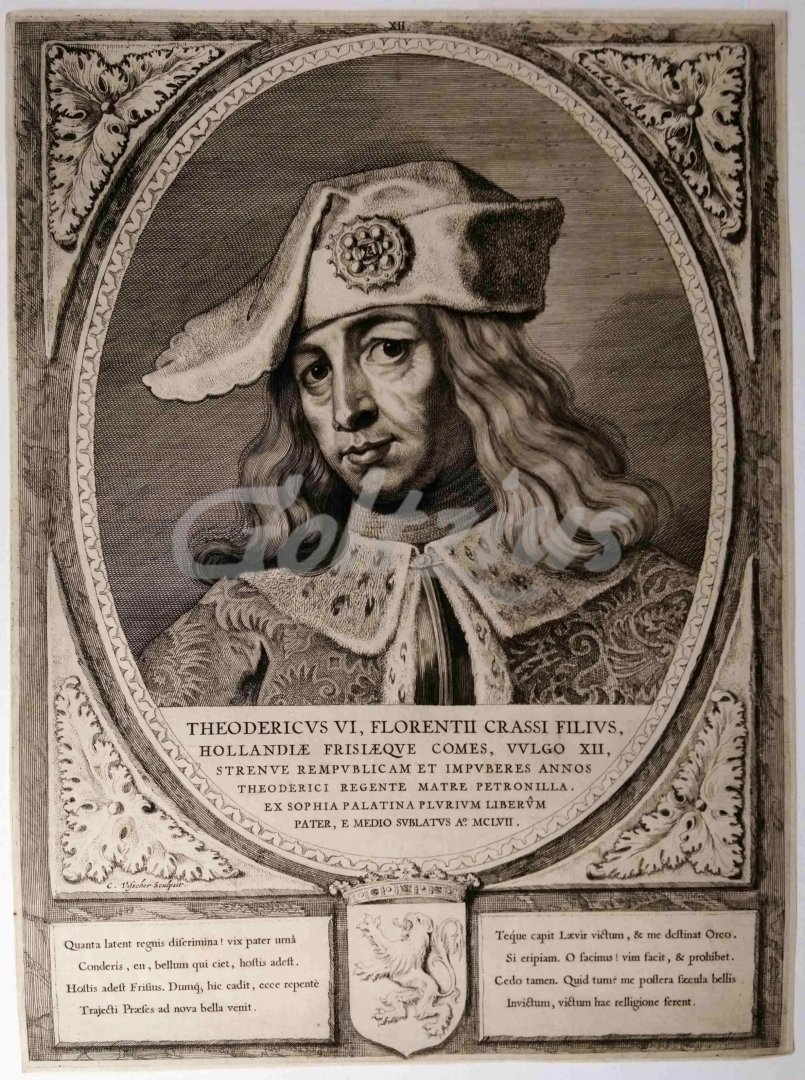 Portrait of Dirk VI 'Theodericus VI, Florentii Crassi filius'. Oval portrait of Dirk VI (1114 - 1157), became a Count of Holland at eight years of age (with Petronilla of Lorraine acting as regent for the first years). Etching and engraving on laid paper. Sheet size 298 x 403 mm., platemark 294 x 398 mm. Made by Cornelis Visscher. Number XII in the top edge of the image. The work 'Principes Hollandiae et Westfrisiae', written by Petrus Scriverius, was published in 1650 by Pieter Soutman in Haarlem, and contained a total of 38 portraits of the Counts of Holland, from the year 863 onward. In good condition, cropped close to the platemark. An old restored tear in the top edge, faint horizontal creasing. Petrus Scriverius (1576 - 1660), the latinised form of Peter Schrijver, was a Dutch author and scholar on the history of the Low Countries, as well as classical literature. References: Hollstein 77-116; Smith 146-185.