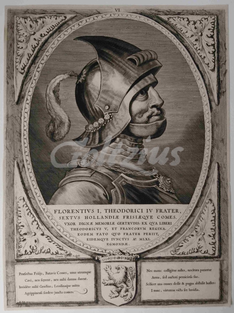 Portrait of Floris I Oval portrait of Floris I (1049 - 1061), who succeeded his brother Dirk IV after his death. Etching and engraving on laid paper. Sheet size 299 x 404 mm., platemark 296 x 398 mm. Made by Cornelis Visscher. Number VI in the top edge of the image. The work 'Principes Hollandiae et Westfrisiae', written by Petrus Scriverius, was published in 1650 by Pieter Soutman in Haarlem, and contained a total of 38 portraits of the Counts of Holland, from the year 863 onward. In very good condition but cropped close to the platemark. Petrus Scriverius (1576 - 1660), the latinised form of Peter Schrijver, was a Dutch author and scholar on the history of the Low Countries, as well as classical literature. References: Hollstein 77-116; Smith 146-185.