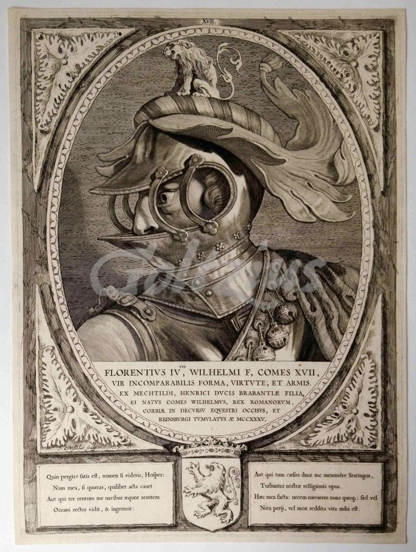 Portrait of Floris IV 'Florentius IVtus, Wilhelmi f, Comes XVII'. Oval portrait of Floris IV (1210 - 1234), Count of Holland from 1222. Etching and engraving on laid paper. Sheet size 307 x 415 mm., platemark 295 x 404 mm. Made by Cornelis Visscher. Number XVII in the top edge of the image. The work 'Principes Hollandiae et Westfrisiae', written by Petrus Scriverius, was published in 1650 by Pieter Soutman in Haarlem, and contained a total of 38 portraits of the Counts of Holland, from the year 863 onward. In very good condition. Petrus Scriverius (1576 - 1660), the latinised form of Peter Schrijver, was a Dutch author and scholar on the history of the Low Countries, as well as classical literature. References: Hollstein 77-116; Smith 146-185.