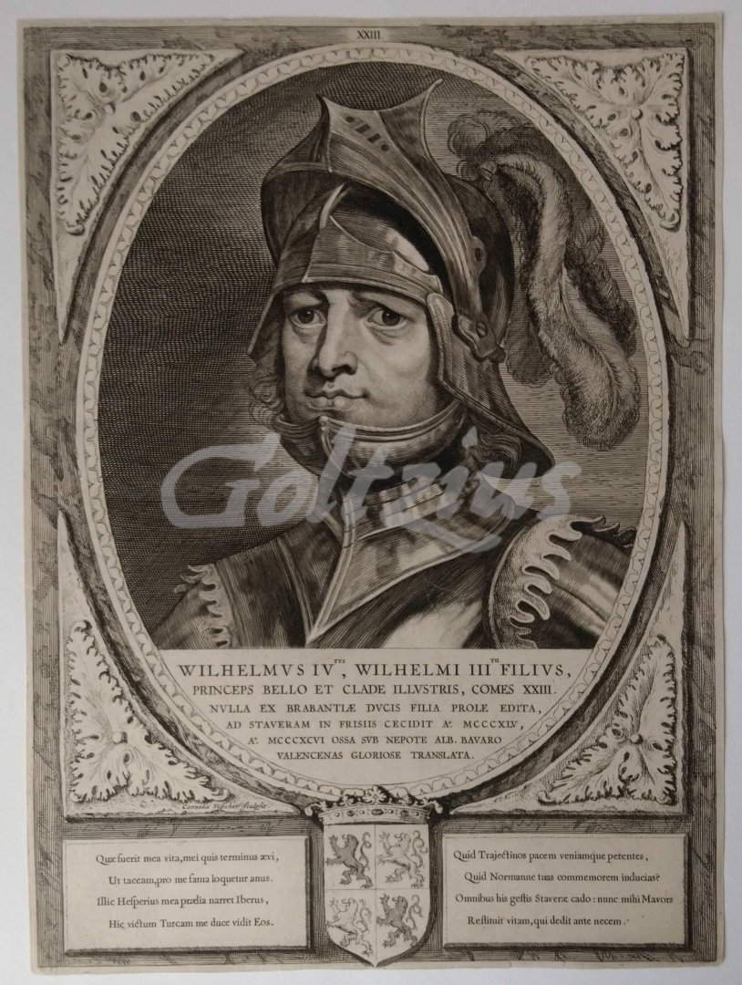 Portrait of William IV, Count of Holland 'Wilhelmus IVtus, Wilhelmi IIItii filius'. Oval portrait of William IV, Willem IV in Dutch (1307 - 1345), count Holland and Zeeland, and also count of Hainaut (as William II). Etching and engraving on laid paper. Sheet size 299 x 408 mm., platemark 298 x 406 mm. Made by Cornelis Visscher. Number XXIII in the top edge of the image. The work 'Principes Hollandiae et Westfrisiae', written by Petrus Scriverius, was published in 1650 by Pieter Soutman in Haarlem, and contained a total of 38 portraits of the Counts of Holland, from the year 863 onward. In very good condition, cropped close to the platemark. Petrus Scriverius (1576 - 1660), the latinised form of Peter Schrijver, was a Dutch author and scholar on the history of the Low Countries, as well as classical literature. References: Hollstein 77-116; Smith 146-185.