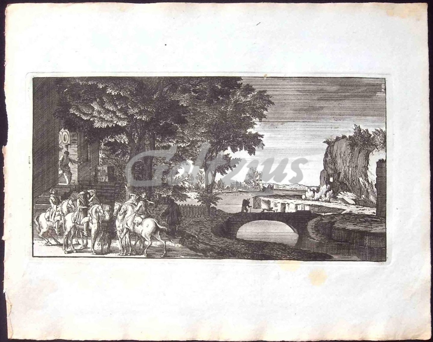 Riders near a river Etching and engraving on wove paper (with watermark J Kool), sheet size ca. 210 x 165 mm., platemark 179 x 89 mm. One of the 76 etchings and engravings from 'Spiegel der natuur en School ter Teekenkunde, bevattende LXXVI afbeeldingen van landschappen, landsdouwen, watergezichten, enz. enz. [...]', Amsterdam: Ed. Van Esveldt-Holtrop, [ca. 1830]. This publication contained a series of prints after various printmakers, including Silvestre, Perelle, Della Bella, Almeloveen, Van Schyndel, Visscher and Schenk. A group of rider stands waiting near an open door. Beside them a river with a person with a dog crossing the bridge. In very good condition, dampstaining in the far top right corner, two small damp spots just below and in the lower edge of the image (not visible in the image).