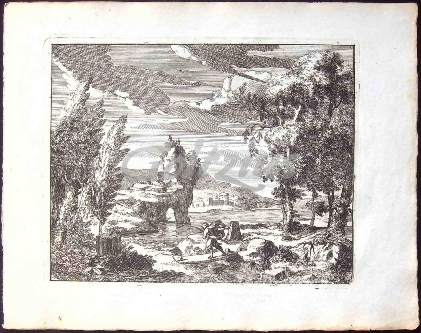 River landscape with a lone walker Etching on wove paper (with watermark J Kool), sheet size ca. 210 x 165 mm., platemark 159 x 125 mm. One of the 76 etchings and engravings from 'Spiegel der natuur en School ter Teekenkunde, bevattende LXXVI afbeeldingen van landschappen, landsdouwen, watergezichten, enz. enz. [...]', Amsterdam: Ed. Van Esveldt-Holtrop, [ca. 1830]. This publication contained a series of prints after various printmakers, including Silvestre, Perelle, Della Bella, Almeloveen, Van Schyndel, Visscher and Schenk. A man, bent over to brace against a strong wind, crosses a short bridge over a stream branching off from a broad river. A structure in the background. In excellent condition.