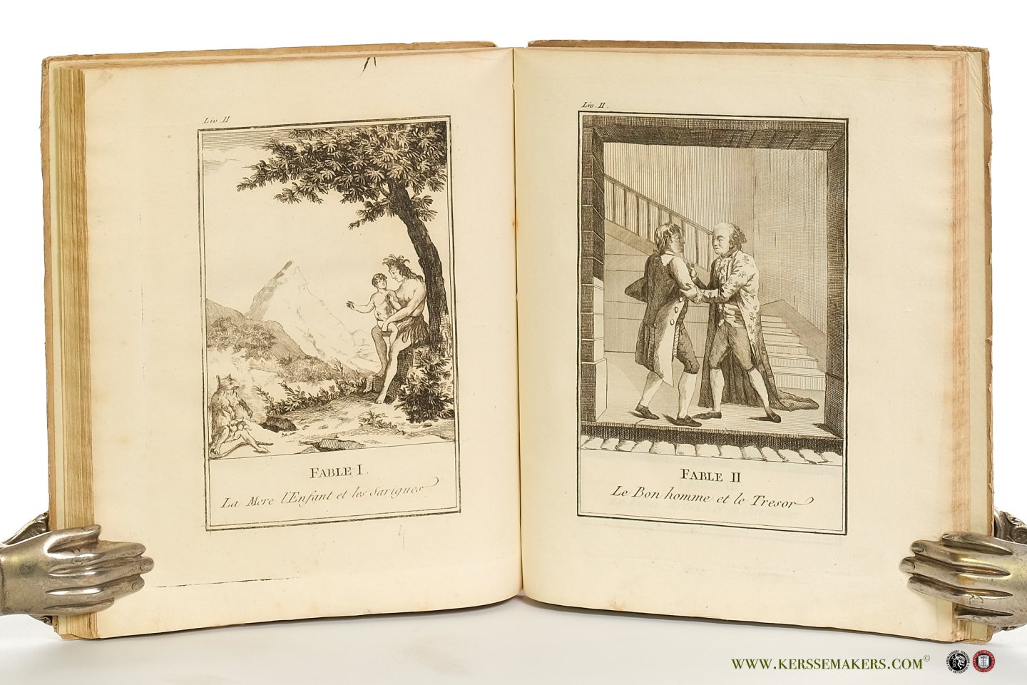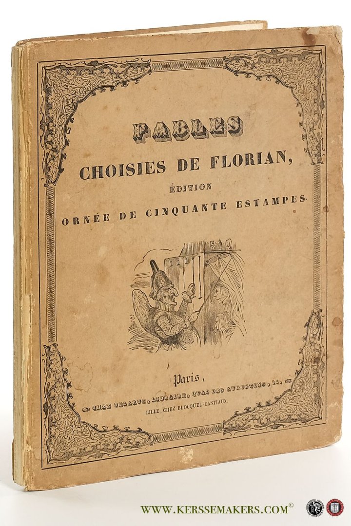corners bumped). 36 pp., incl. ornemental title. Printed in 2 columns. With 50 large engraved plates (18x12 cm): portrait of J. P. Clarisse Florian and 49 engravings for the 49 fables described. - 1 plate for "Le Petit Chien" is placed in place of "La Taupe et les Lapins". - The plate for the first fable "La Fable et la Vérité" neatly coloured by hand.
