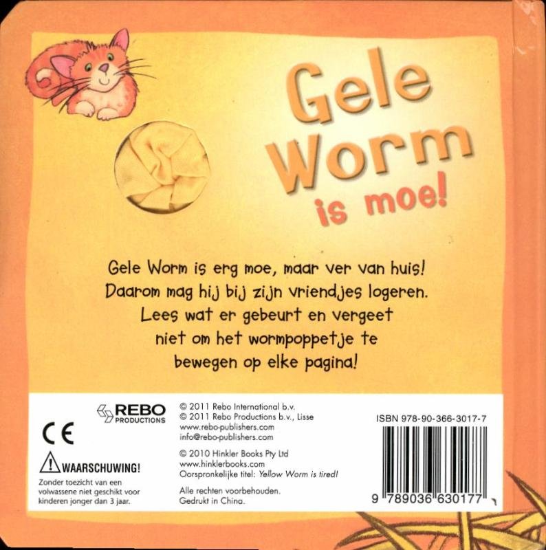| Meer info: | Gele Worm is erg moe, maar ver van huis!Daarom mag hij bij zijn vriendjes logeren.Lees wat er gebeurt en vergeetniet om het wormpoppetje tebewegen op elke pagina! |