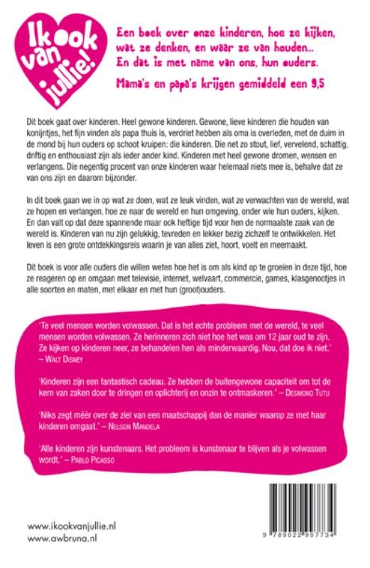 Een boek over onze kinderen, hoe ze kijken, wat ze denken, en waar ze van houden...En dat is met name van ons, hun ouders. Mamas en papas krijgen gemiddeld een 9,5Dit boek gaat over kinderen. Heel gewone kinderen. Gewone, lieve kinderen die houden van konijntjes, het fijn vinden als papa thuis is, verdriet hebben als oma is overleden, met de duim in de mond bij hun ouders op schoot kruipen: die kinderen. Die net zo stout, lief, vervelend, schattig, driftig en enthousiast zijn als ieder ander kind. Kinderen met heel gewone dromen, wensen en verlangens. Die negentig procent van onze kinderen waar helemaal niets mee is, behalve dat ze van ons zijn en daarom bijzonder.In dit boek gaan we in op wat ze doen, wat ze leuk vinden, wat ze verwachten van de wereld, wat ze hopen en verlangen, hoe ze naar de wereld en hun omgeving, waaronder hun ouders, kijken. En dan valt op dat deze spannende maar ook heftige tijd voor hen de normaalste zaak van de wereld is. Kinderen van nu zijn gelukkig, tevreden en lekker bezig zichzelf te ontwikkelen. Het leven is een grote ontdekkingsreis waarin je van alles ziet, hoort, voelt en meemaakt.Dit boek is voor alle ouders die willen weten hoe het is om als kind op te groeien in deze tijd, hoe ze reageren op en omgaan met televisie, internet, welvaart, commercie, games, lasgenootjes in alle soorten en maten, met elkaar en met hun (groot)ouders.Te veel mensen worden volwassen. Dat is het echte probleem met de wereld, te veel mensen worden volwassen. Ze herinneren zich niet hoe het was om 12 jaar oud te zijn. Ze kijken op kinderen neer, ze behandelen hen als minderwaardig. Nou, dat doe ik niet. Walt DisneyKinderen zijn een fantastisch cadeau. Ze hebben de buitengewone capaciteit om tot de kern van zaken door te dringen en oplichterij en onzin te ontmaskeren. Desmund TutuNiks zegt méér over de ziel van een maatschappij dan de manier waarop ze met haar kinderen omgaat. Nelson MandelaAlle kinderen zijn kunstenaars. Het probleem is kunstenaar te blijven als je volwassen wordt. Pablo Picasso