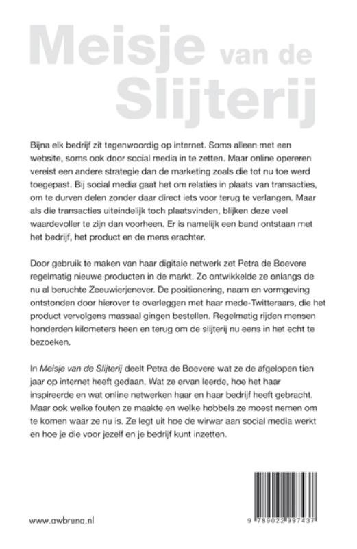 Bijna elk bedrijf zit tegenwoordig op internet. Soms alleen met een website, soms ook door social media in te zetten. Maar online opereren vereist een andere strategie dan de marketing zoals die tot nu toe werd toegepast. Bij social media gaat het om relaties in plaats van transacties, om te durven delen zonder daar direct iets voor terug te verlangen. Maar als die transacties uiteindelijk toch plaatsvinden, blijken deze veel waardevoller te zijn dan voorheen. Er is namelijk een band met het bedrijf, het product en de mens erachter ontstaan. Door gebruik te maken van haar digitale netwerk zet Petra de Boevere regelmatig nieuwe producten in de markt. Zo ontwikkelde ze onlangs de nu al beruchte Zeeuwierjenever. De positionering, naam en vormgeving ontstonden door hierover te overleggen met haar mede-Twitteraars, die het product vervolgens massaal gingen bestellen. Regelmatig rijden mensen honderden kilometers heen en terug om de slijterij nu eens in het echt te bezoeken. In Meisje van de Slijterij deelt Petra de Boevere wat ze de afgelopen tien jaar op internet heeft gedaan. Wat ze ervan leerde, hoe het haar inspireerde en wat online netwerken haar en haar bedrijf heeft gebracht. Maar ook welke fouten ze maakte en welke hobbels ze moest nemen om te komen waar ze nu is. Ze legt uit hoe de op het eerste oog wirwar aan social media werkt en hoe je die voor jezelf en je bedrijf in kunt zetten.