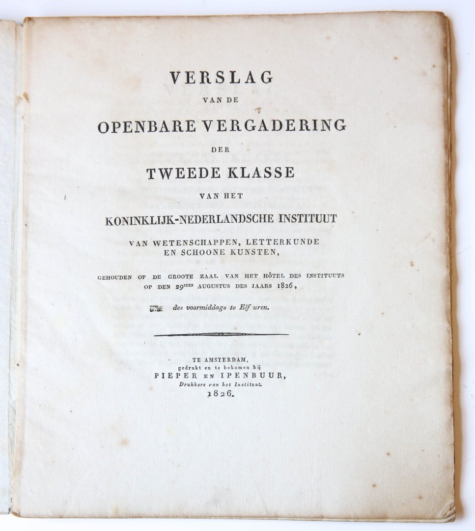 | Titel: | Verslag van de openbare vergadering der Tweede Klasse van het Koninklijk-Nederlansche instituut van Wetenschappen, Letterkunde en Schoone Kunsten. Gehouden op de groote zaal van het hotel des instituuts op den 29sten augustus des jaars 1826, A... |