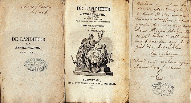 | Titel: | De landheer van Sterrenberg, blijspel in vier bedrijven. Vrij gevolgd naar het Hoogduitsch van J. von Weiszenthurm, door C.J. Roobol. (Exemplaar voor de souffleur!) |