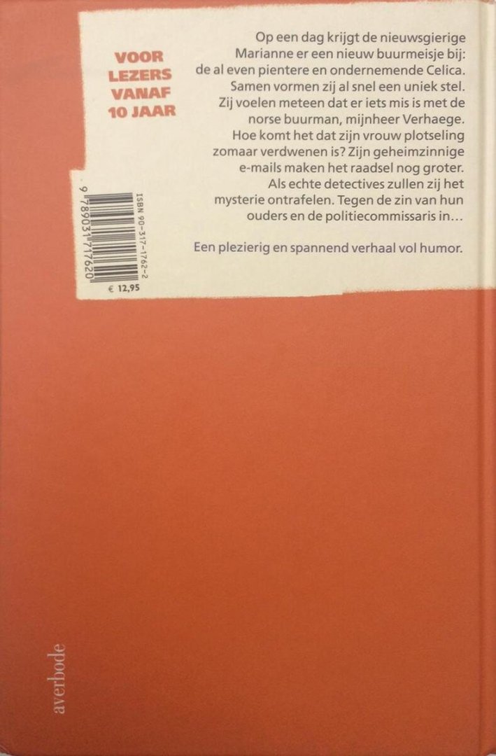 Samen vormen zij al snel een uniek stel. Zij voelen meteen dat er iets mis is met de norse buurman, mijnheer Verhaege. Hoe komt het dat zijn vrouw plotseling zomaar verdwenen is? Zijn geheimzinnige e-mails maken het raadsel nog groter. Als echte detectives zullen zij het mysterie ontrafelen. Tegen de zin van hun ouders en de politiecommissaris in... Een plezierig en spannend verhaal vol humor. |