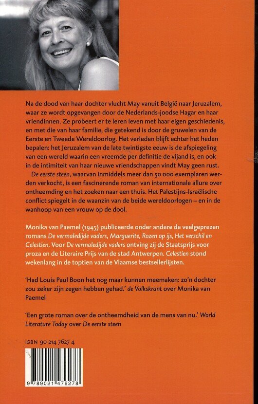 Na de dood van haar dochter vlucht May vanuit België naar Jeruzalem, waar ze wordt opgevangen door de Nederlands-joodse Hagar en haar vriendinnen. Ze probeert er te leren leven met haar eigen geschiedenis en met die van haar familie, die getekend is door de gruwelen van de Eerste en Tweede Wereldoorlog. Het verleden blijft echter het heden bepalen: het Jeruzalem van de late twintigste eeuw is de afspiegeling van een wereld waarin een vreemde per definitie de vijand is, en ook in de intimiteit van haar nieuwe vriendschappen vindt May geen rust. De eerste steen, waarvan inmiddels meer dan 50 000 exemplaren werden verkocht, is een fascinerende roman van internationale allure over ontheemding en het zoeken naar een thuis. Het Palestijns-Israëlische conflict spiegelt in de waanzin van de beide wereldoorlogen en in de wanhoop van een vrouw op de dool.